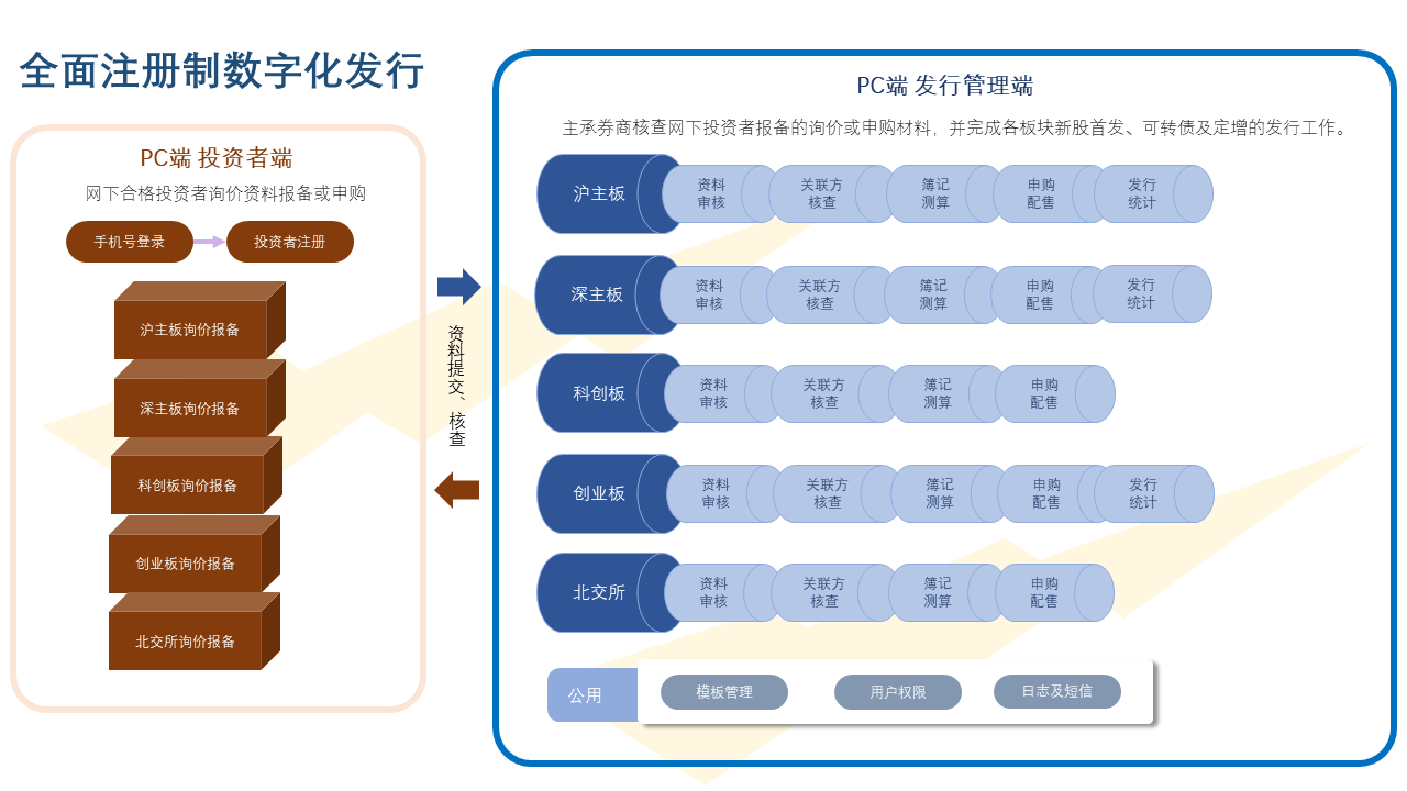 全面注册制的推行,意味核准制IPO发行将正式落下帷幕。由于注册制网下发行与核准制发行有较大差别,原核准制IPO网下发行系统也将进行大幅度改造。基于科创板、创业板及北交所的注册制网下发行系统经验,博证将建设符合证监会《首次公开发行股票注册管理办法》及上交所、深交所发行承销细则的沪主板IPO、深主板IPO发行管理子系统,形成涵盖沪主板、深主板、科创板、创业板、北交所全板块的注册制发行管理平台。
